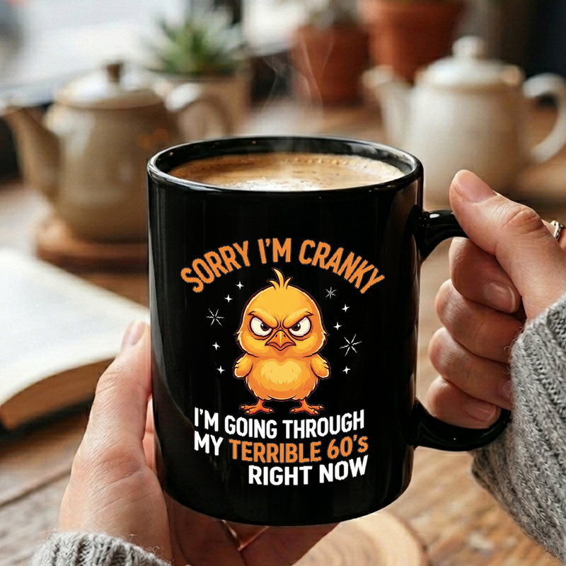 Funny cartoon chick illustration with a relatable 'cranky' message. Perfect for those embracing their 60s with humor!